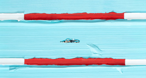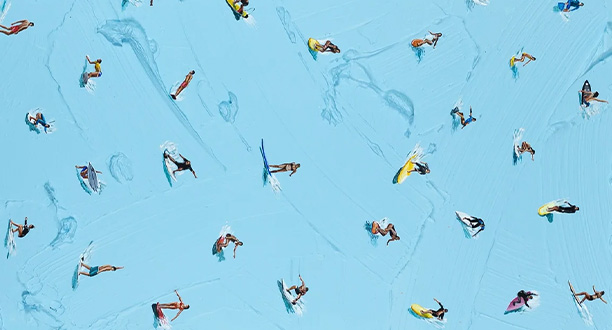 “Underwater Romance and Adventure,” which visually amplifies the freedom and pleasure of water and summer by floating small figures on waves of paint.