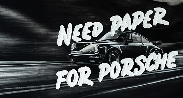 “Cynical about speed and desire,” a satire of the ‘crisis brought about by money or desire’ through 1970s supercar drawings and bold text.